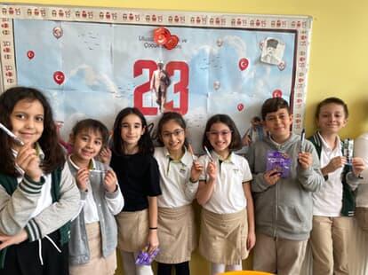 На 23 април – Република Турция отбелязва „Ден на националния суверенитет и детето“. Във връзка с празника се проведе международна инициатива между учениците от VI б клас с класен ръководител Елмаз Юсуф и техни връстници от „Doğa Koleji Özlüce Oxford“ гр. Бурса. С удоволствие нашите ученици приеха поканата за размяна на подаръци. Ръчно изработени гривни и поздравителни картички зарадваха учениците ни. От своя страна те подготвиха персонализирани химикали, с имената им написани на кирилица и сувенири от България.